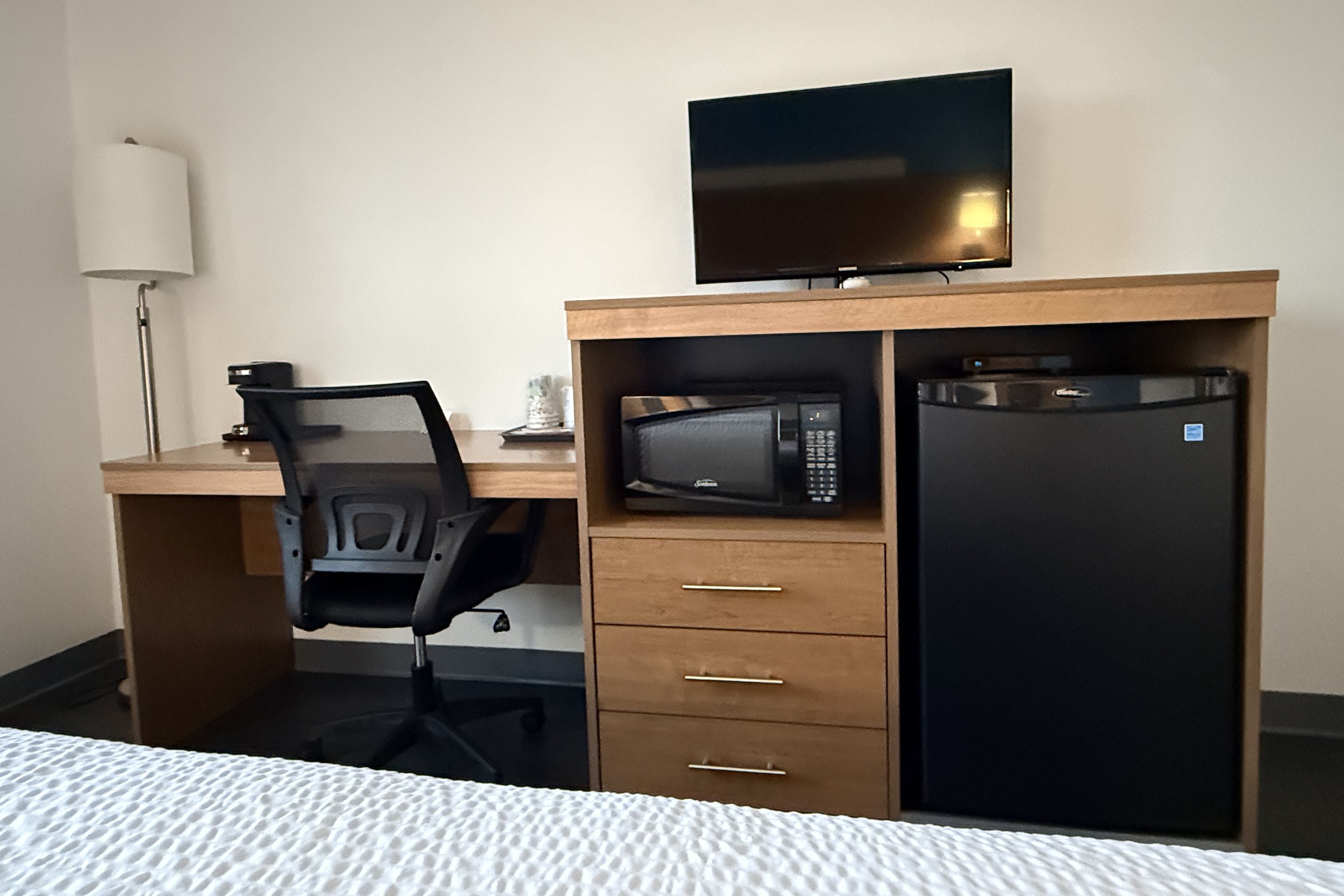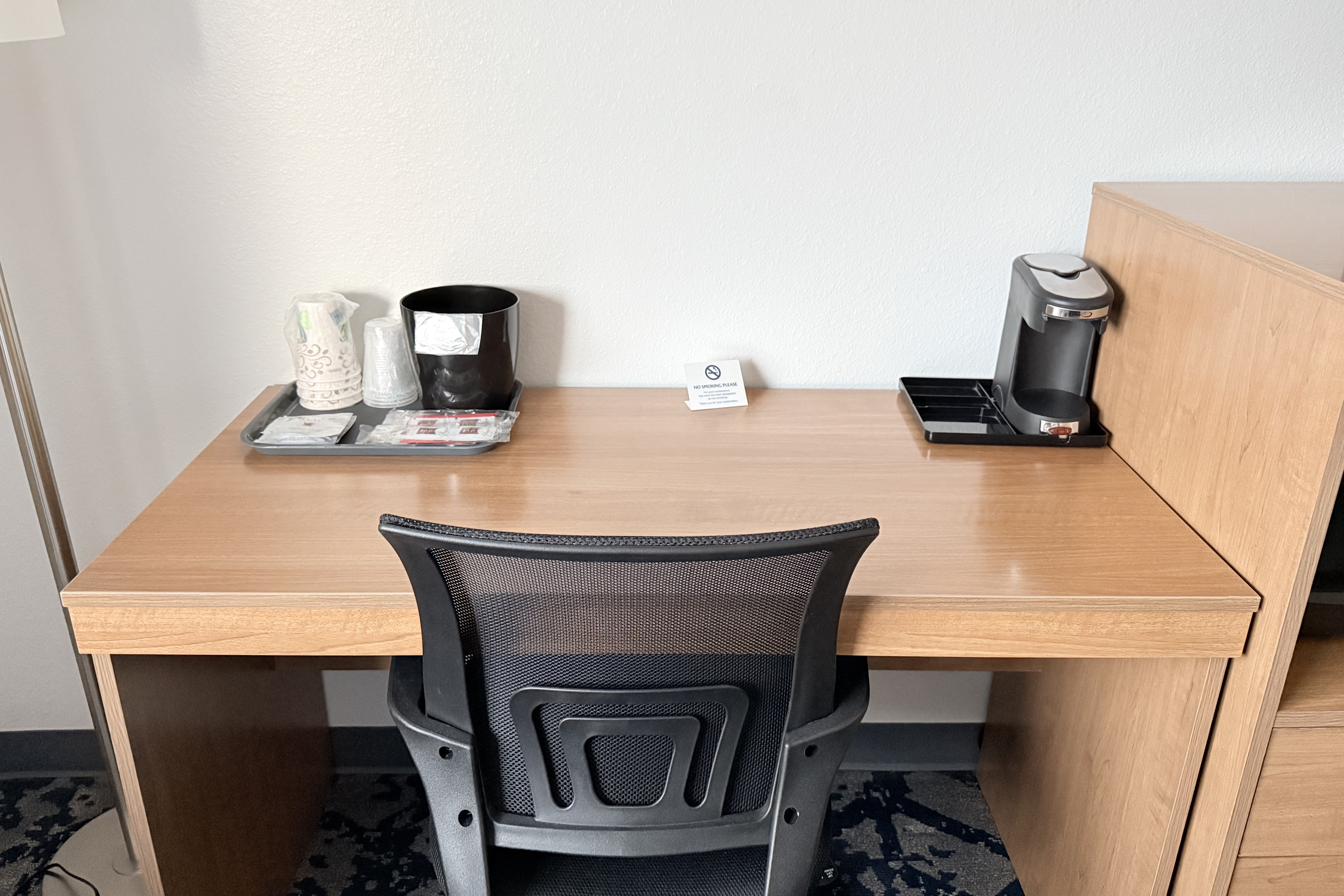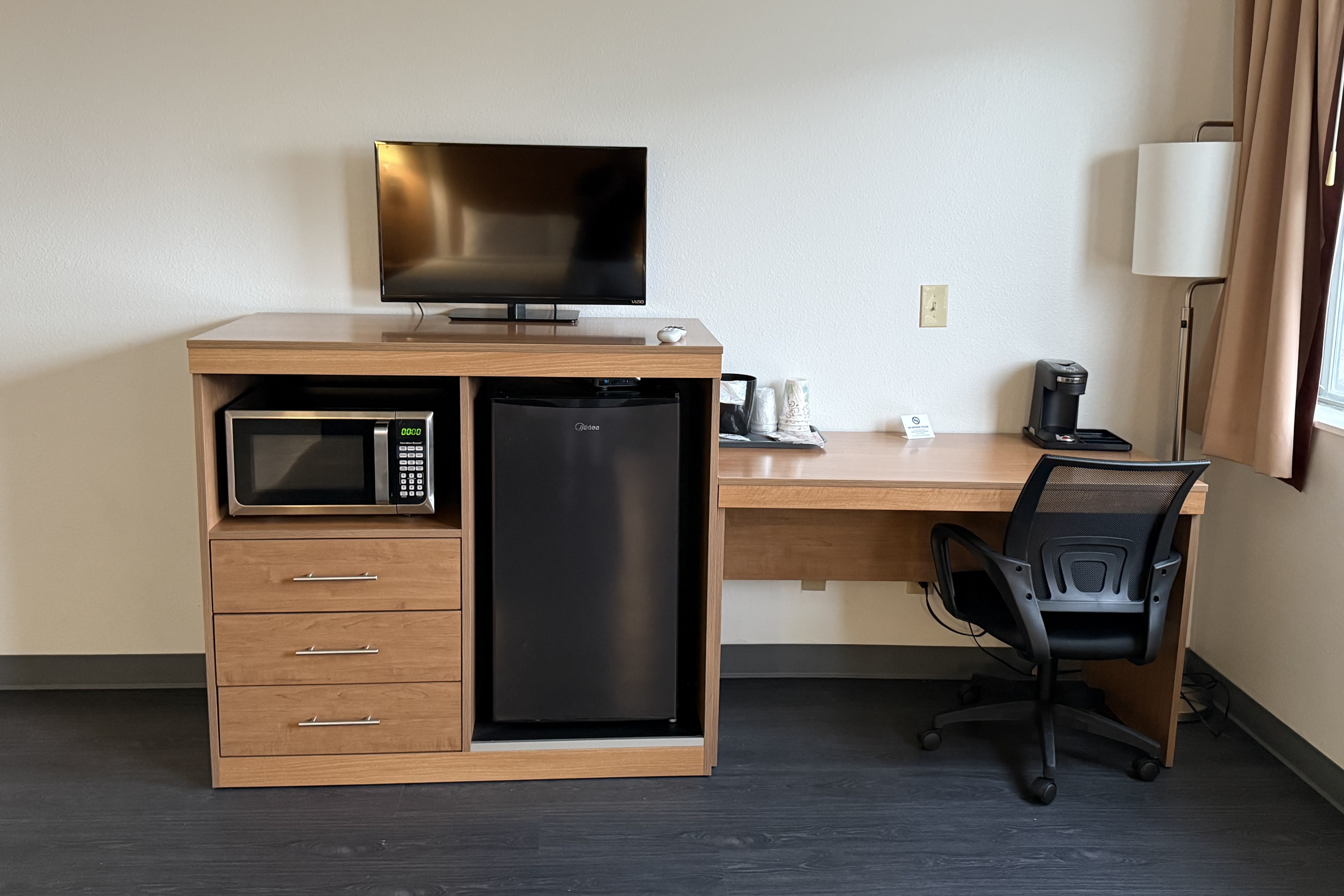 Fuel up for the day with a free breakfast of waffles, bagels, yogurt, and more. Stream your favorite shows and check emails using free WiFi, come and go with ease thanks to free parking, and grab a snack from the vending machines. Each non-smoking guest room features a mini-refrigerator, microwave, coffee/tea maker, flat-screen HDTV, desk, ironing amenities, hair dryer, bath products, and lighted makeup mirror. Ask our friendly 24/7 front desk staff for anything you need and bring along up to two pets for an extra nightly fee.
