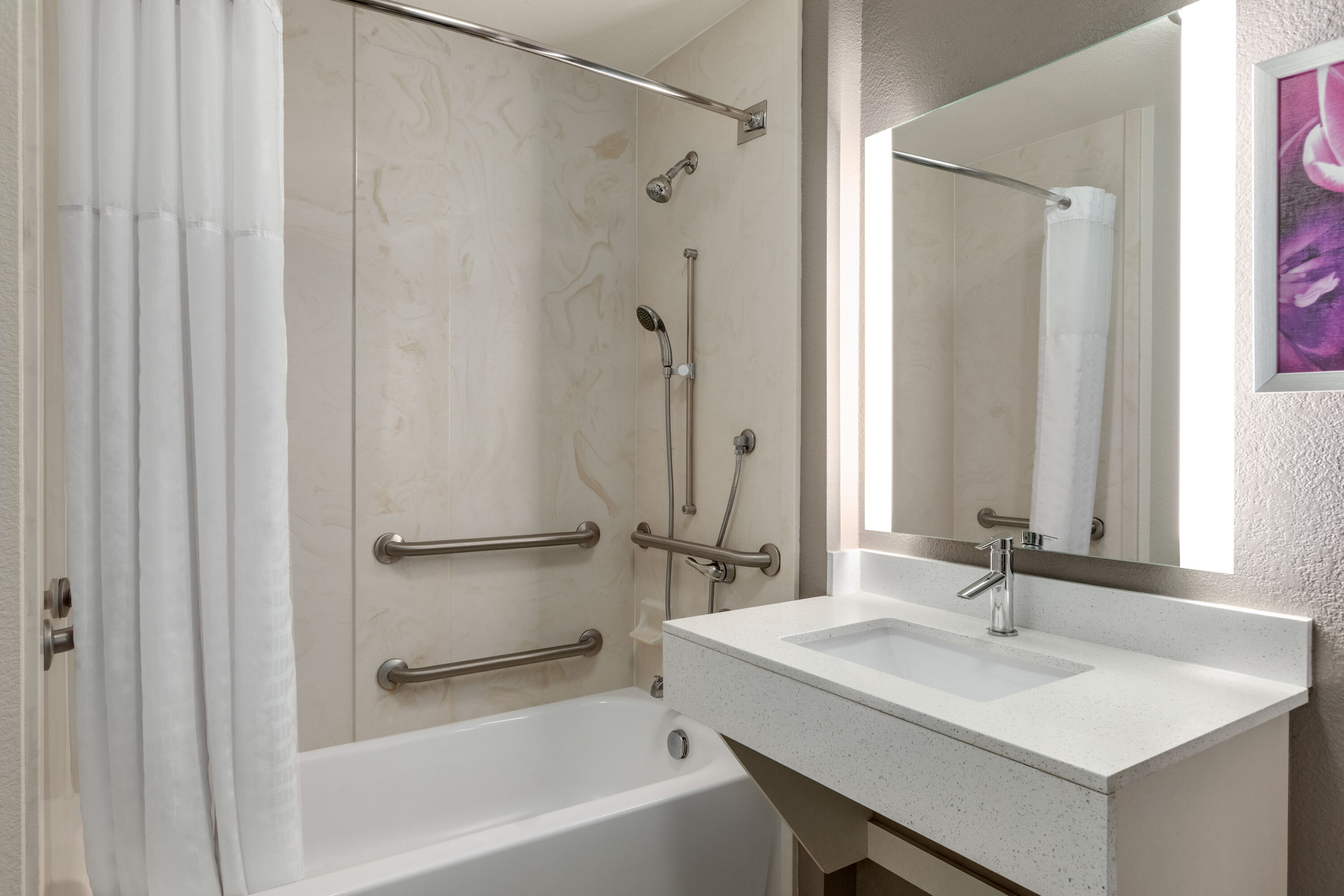 Start your mornings with a free Bright Side Breakfast®, work out in our 24/7 fitness center, and make time for relaxation in our outdoor pool and hot tub. Free WiFi, a business center, and extensive meeting spaces are available when work calls. Unwind in one of our pet-friendly guest rooms, featuring a mini-refrigerator, microwave, flat-screen HDTV, desk, coffee/tea maker, ironing amenities, and hair dryer. Plus, take advantage of extras like our local area shuttle running to AT&T Stadium and Globe Life Field and airport shuttle to DFW airport (running daily from 7 a.m.–11 p.m. for an extra fee), laundry facilities, Bright Side Market, and free parking for cars, buses, and trucks.