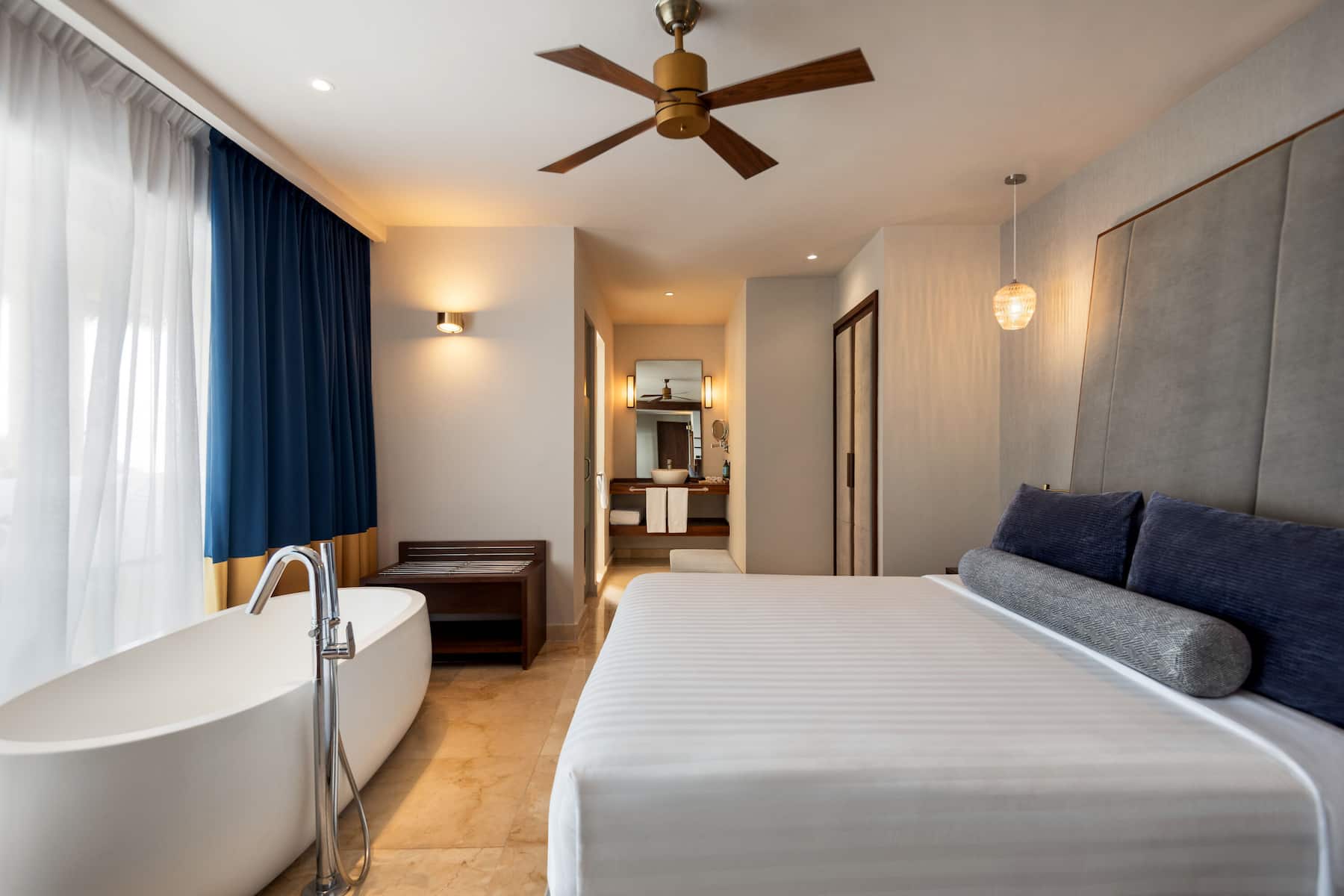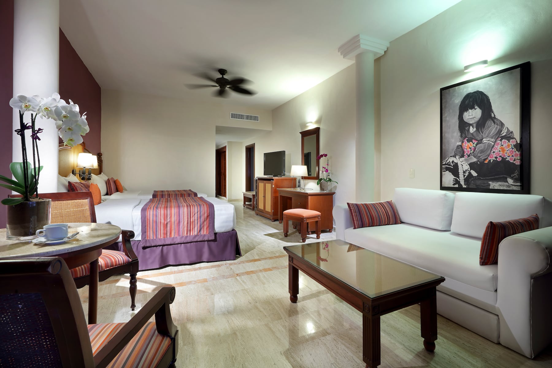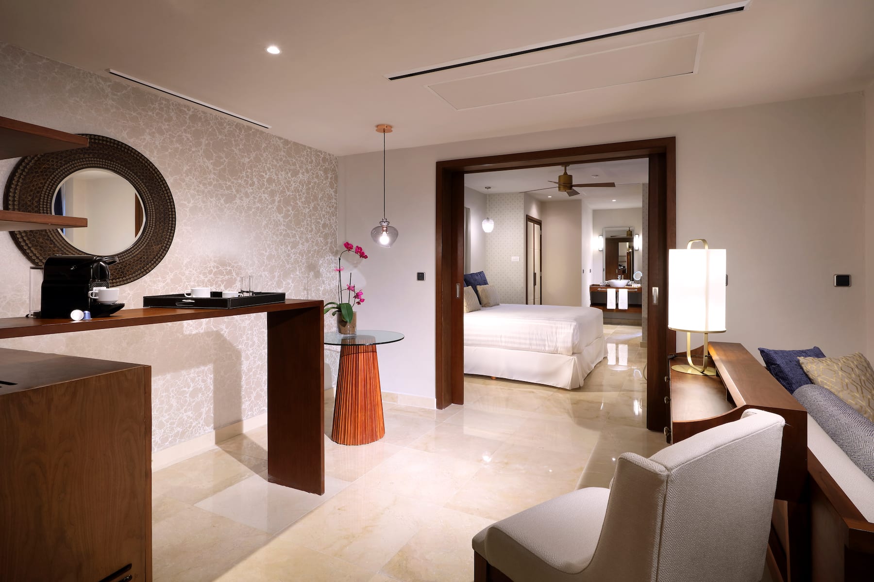 Once you settle into one of the resort’s 510 spacious, non-smoking rooms or suites, you’ll find it difficult to leave. Savor awe-inspiring views of the Pacific Ocean or lush tropical forests from a private furnished balcony. Curb every craving with 24/7 room service (a $15 USD delivery fee applies) and a well-stocked minibar. Free WiFi makes it easy to check emails and share your latest vacation highlights while a 42-inch flat-screen TV lets you chill out with a movie. Soak in the soothing hydromassage tub in the spa-like bathroom—also featuring a shower, deluxe bath products, and hair dryer—and get a good night’s sleep thanks to blackout curtains and plush memory foam mattresses. All accommodations also feature a sitting area with a table and chairs, desk, coffee/tea maker, safe, ironing amenities, and bottled water. For the ultimate stay in Punta Mita, book a luxurious suite with a hot tub on the terrace, panoramic ocean views, and spacious living room.